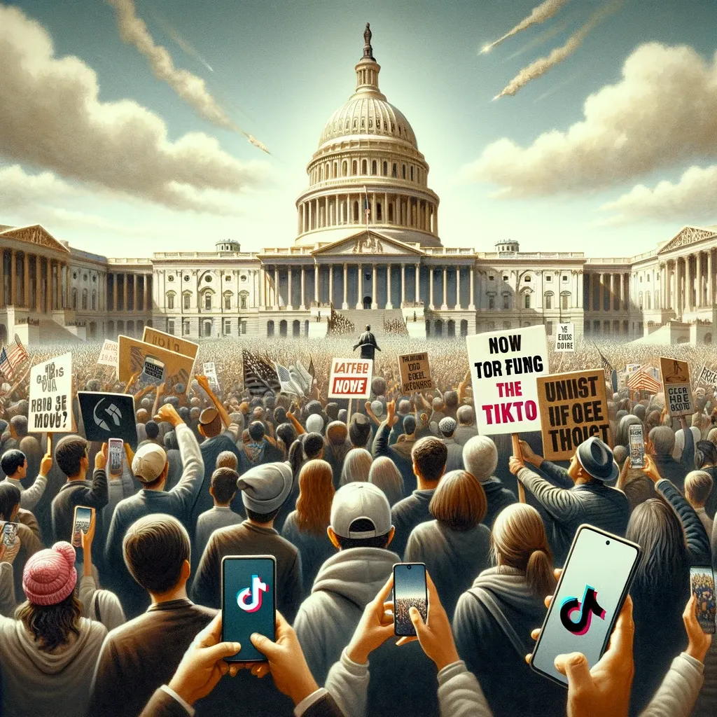 The image is generated with DALLE-3 from OpenAI by the following prompt: "Generate an image on the US banning TikTok App with people protesting outside the US Congress" with Gen ID: "cawALt1t0PJokW0d". The artwork depicting a scene outside the US Congress, with people protesting the ban on the TikTok app, has been created. It captures the diverse crowd, their signs and banners, the Capitol building in the background, and the use of smartphones by protesters, reflecting a peaceful but energetically charged atmosphere of civic engagement. By the way, DALLE-3 still cannot generate words on pictures properly.